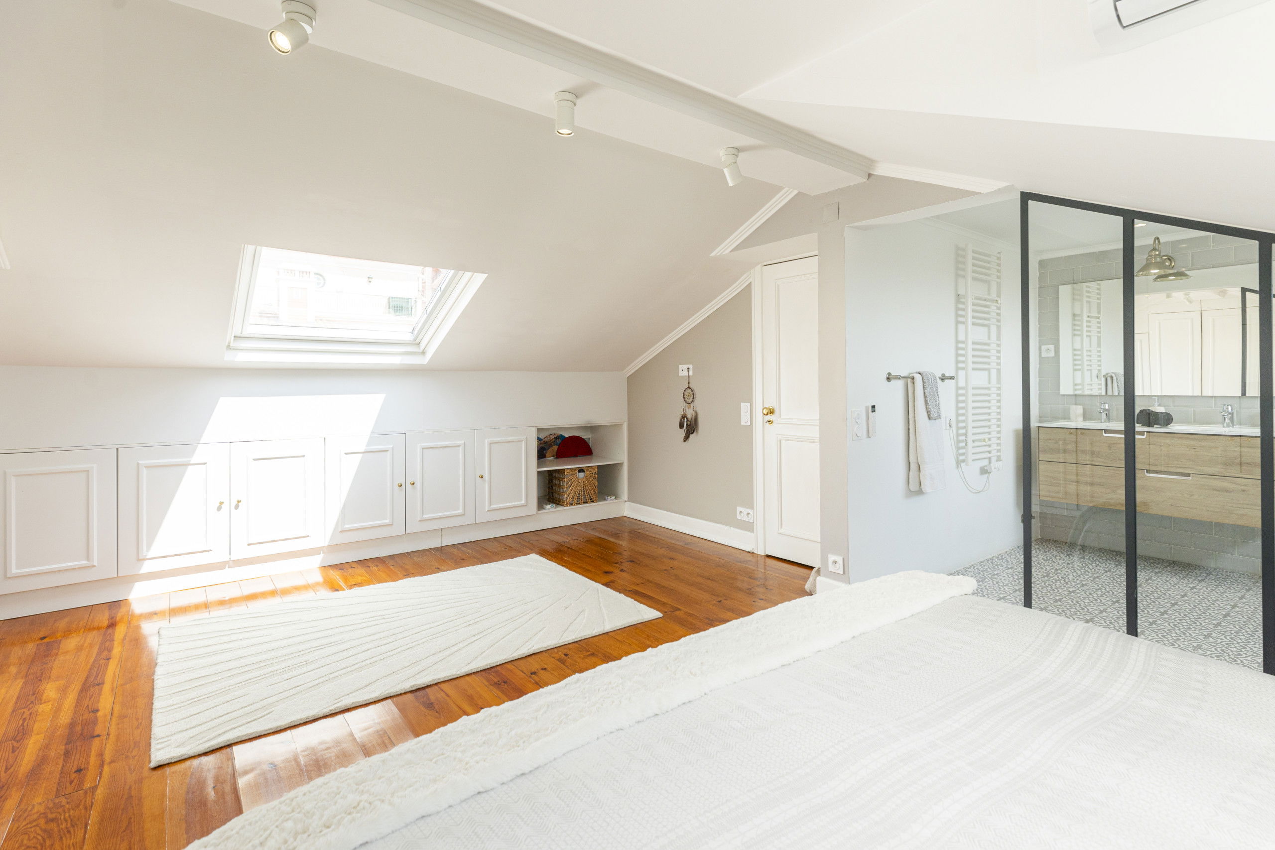 Upstairs we find a double bedroom with open plan ensuite bathroom and built-in wardrobes. This apartment is unique as it has multiple built-in wardrobes for ample storage needs.