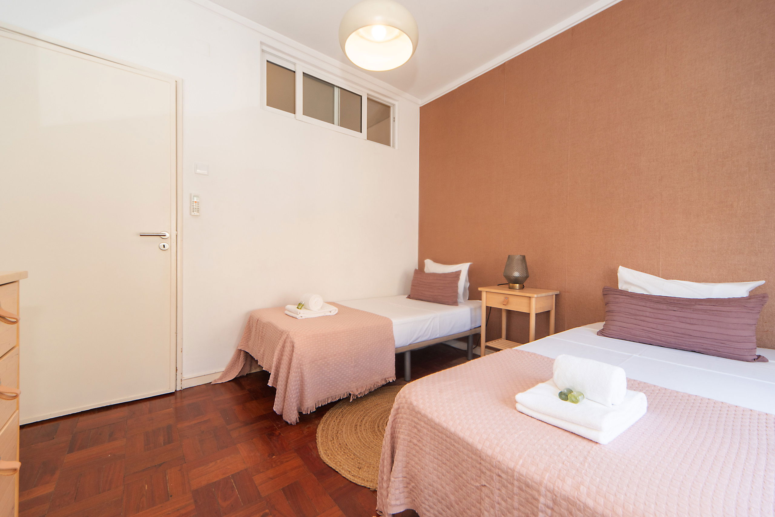 Two bedrooms: one with a double bed, and another with two single beds